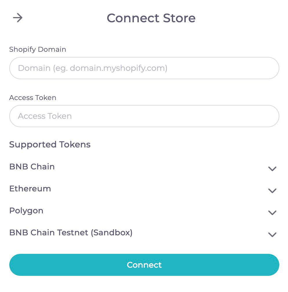 Go to the [Shopify](https://app.8pay.network/shopify) section and click *Connect* in the top right corner.