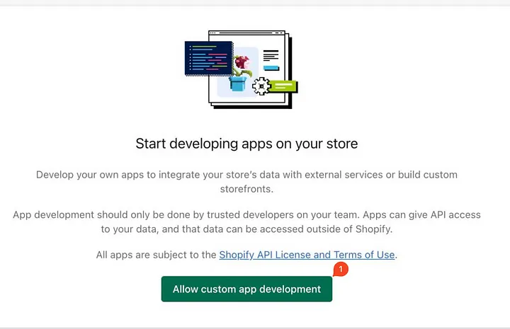 If it is your first time creating an App on your store, you must enable the "Custom App Development" as shown below.